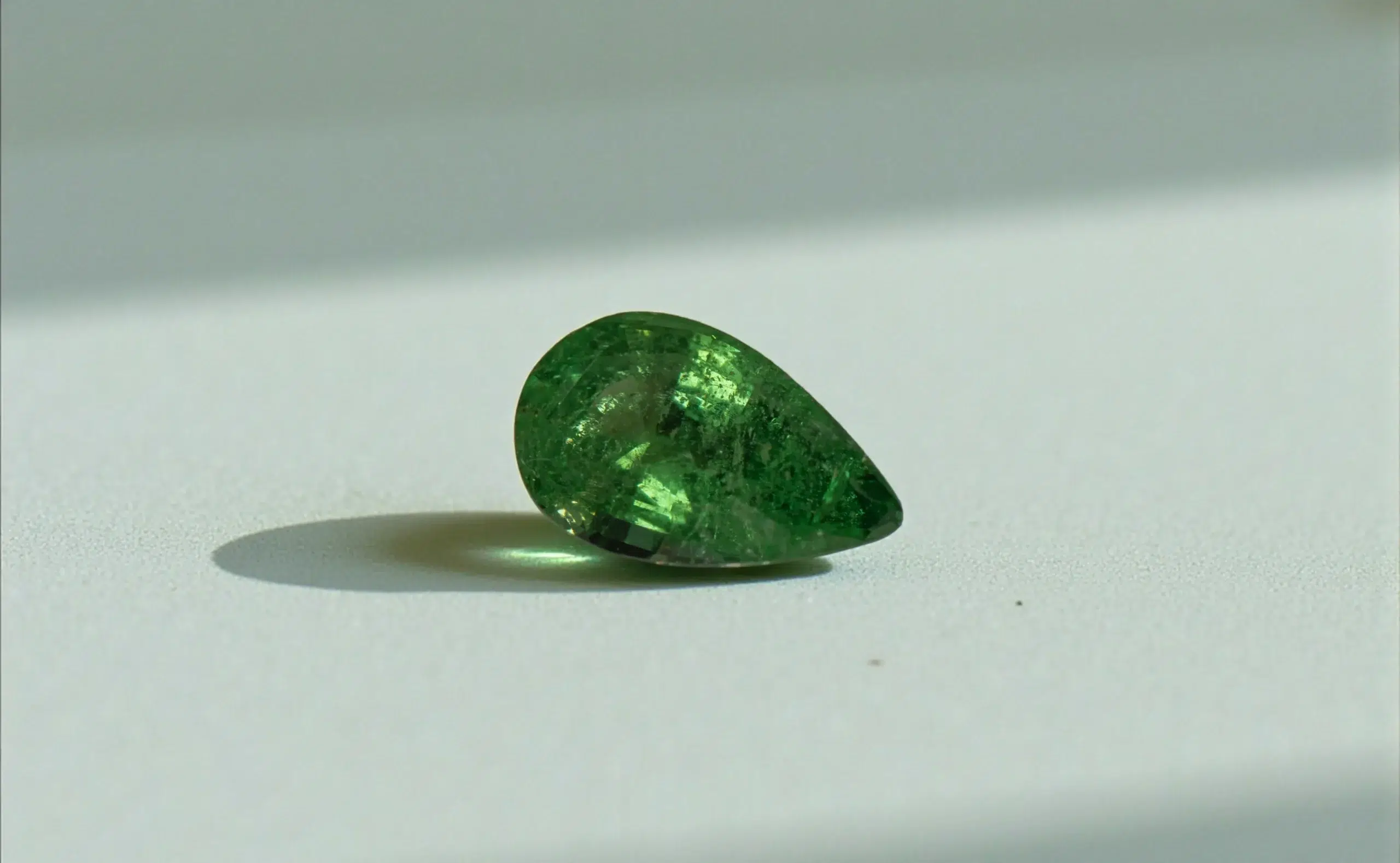 This pear-cut tsavorite garnet displays a deep, saturated green with pronounced natural character and movement. The colour reads rich and earthy rather than electric, with internal flashes of light that give the stone depth and a sense of organic vitality.