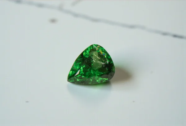 This fine tsavorite garnet displays a vivid, saturated green with a bright, open appearance and crisp light return. Cut in a softly triangular form, the stone shows excellent brilliance and a lively surface presence, with fewer visual interruptions and a more crystalline feel.