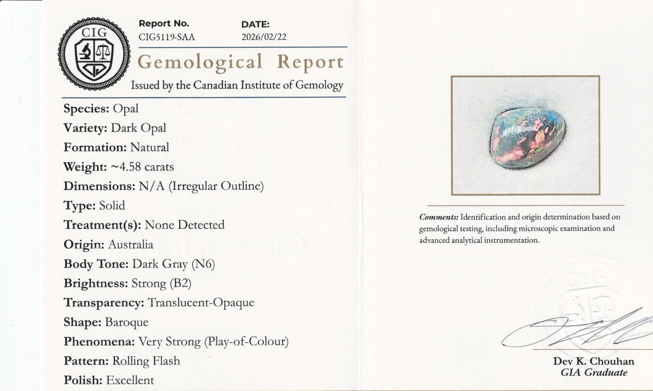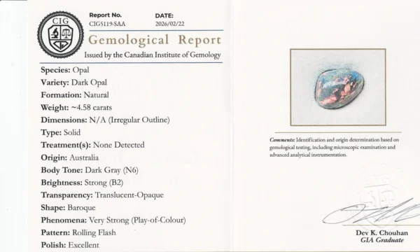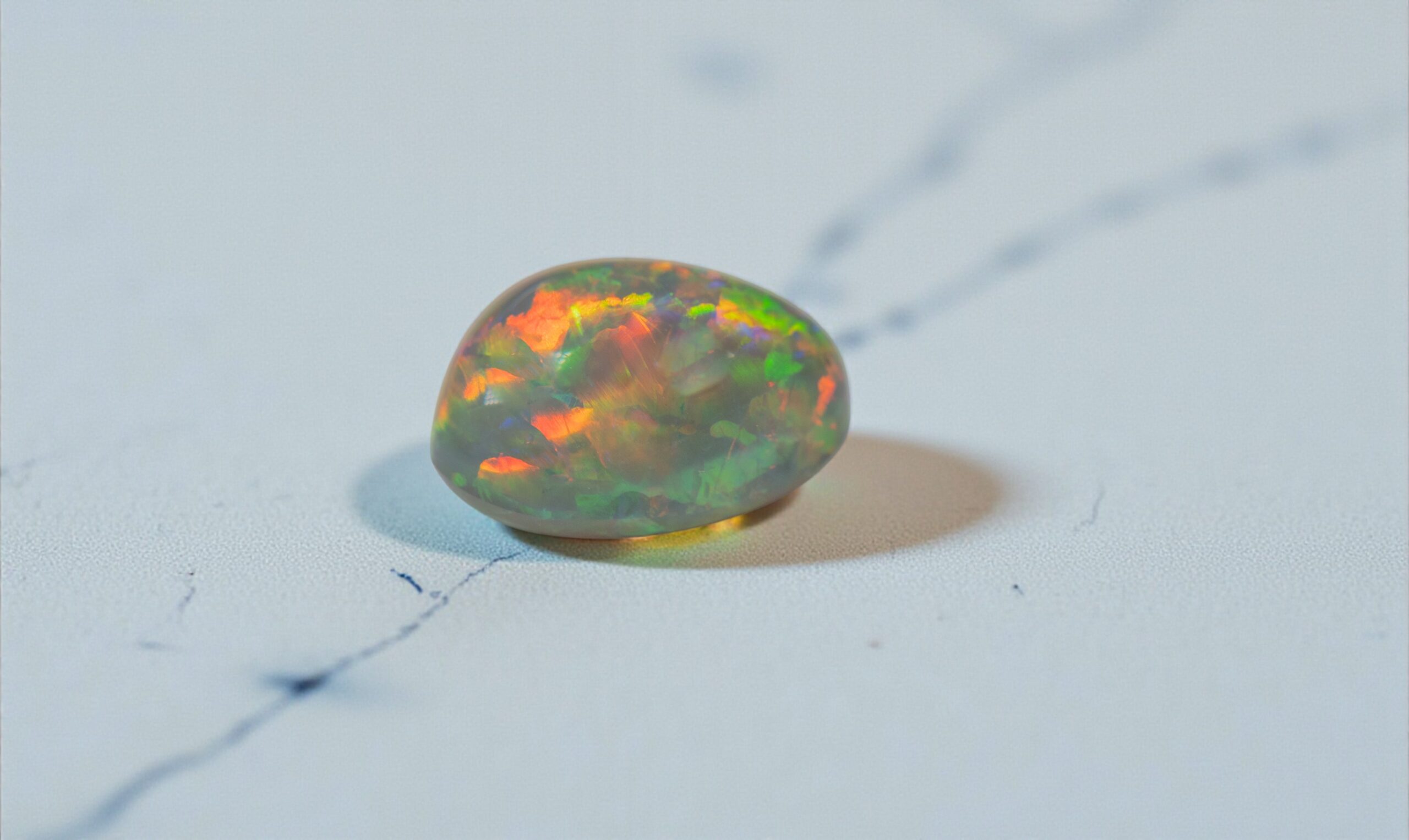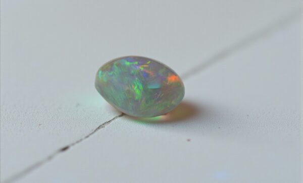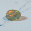 This black opal displays a deep, moody body tone animated by vibrant flashes of green, gold, and fiery orange. As the stone moves, the colour play shifts across the surface in soft, painterly patterns, giving it depth and quiet drama rather than sharp contrast.