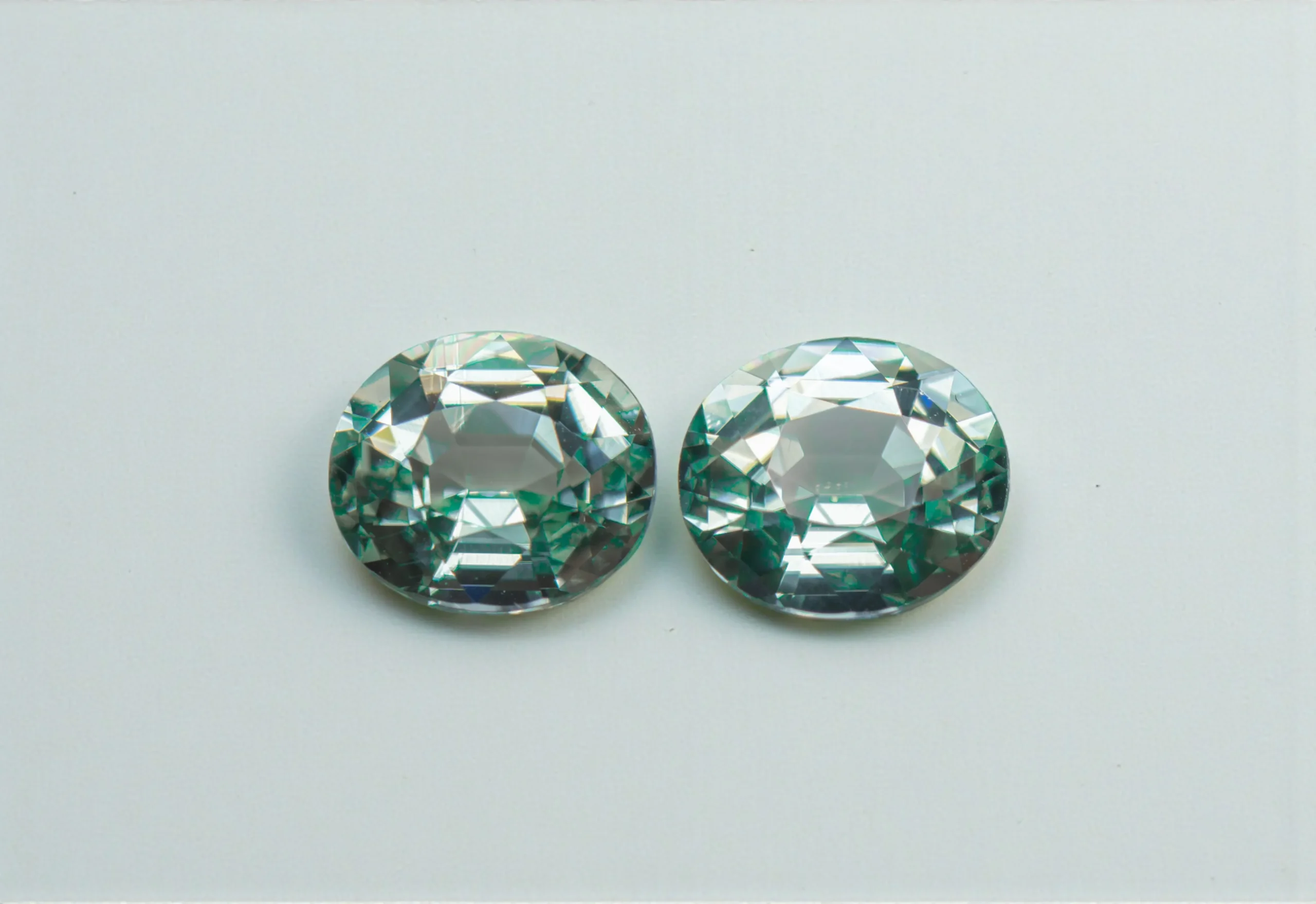 This matched pair of Afghani mint tourmalines displays a delicate blend of cool mint-green and soft aqua tones, like sea foam, with excellent clarity and lively brilliance. Cut as ovals by master lapidaries in Idar-Oberstein, the stones show refined symmetry, precise facet alignment, and a clean, glass-like light return.