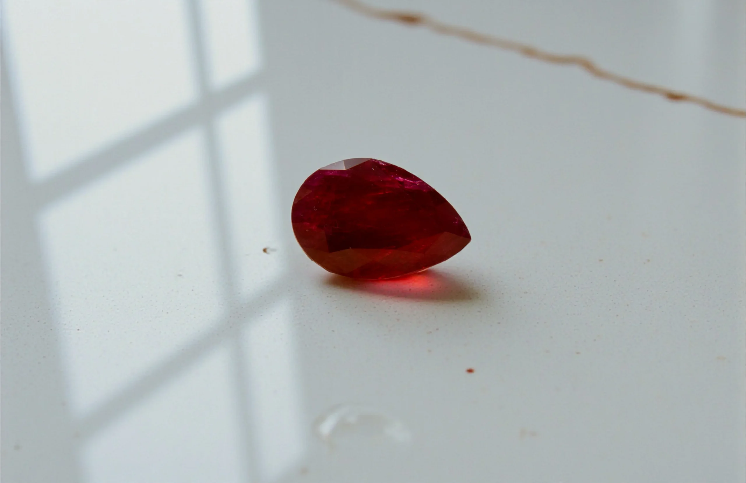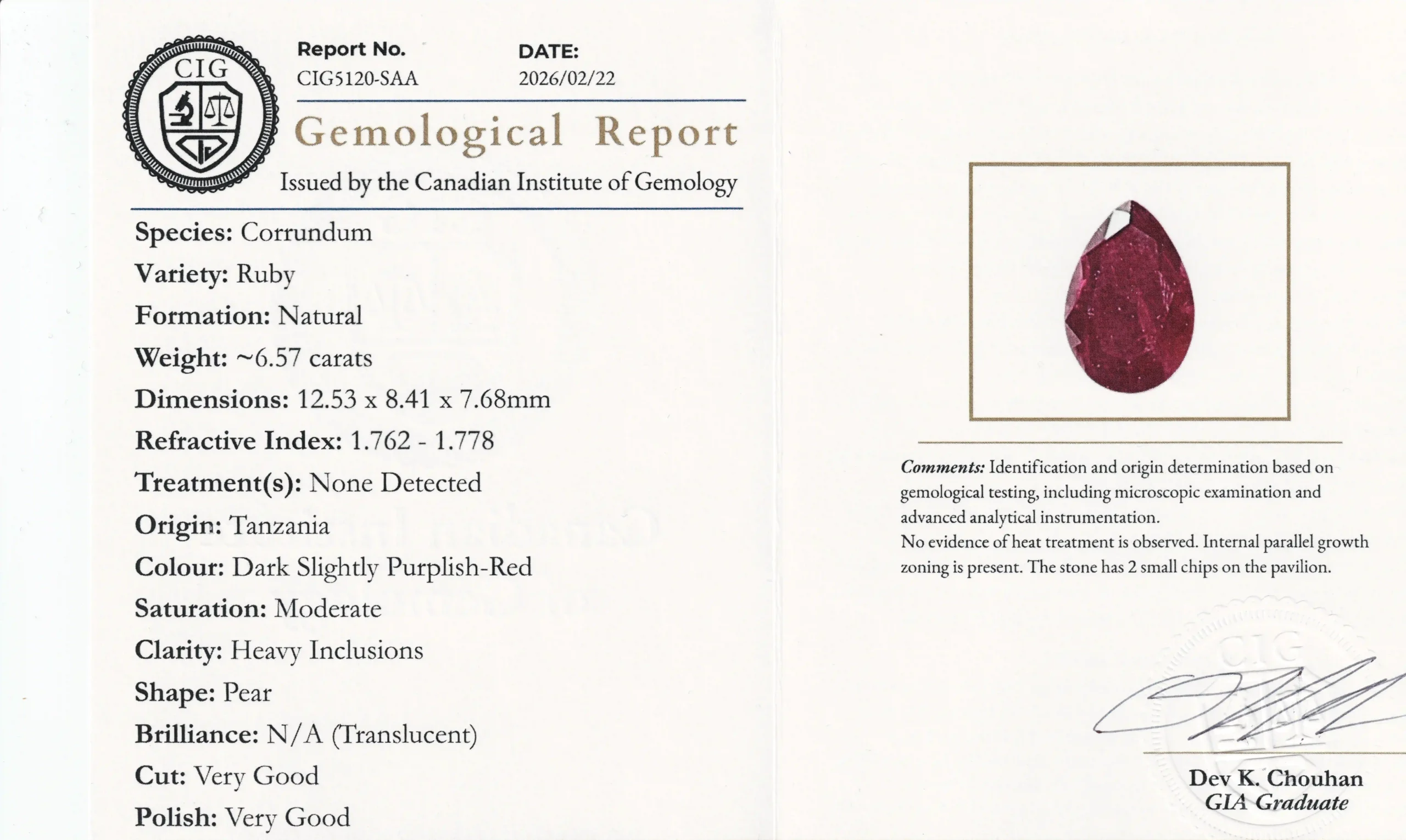This 6.57-carat Tanzanian ruby displays a rich, saturated red with subtle crimson and raspberry undertones, offering warmth and depth rather than stark intensity. Cut in an elegant pear form, the stone carries a sense of movement and presence, with light passing through its body to reveal natural internal character and tonal variation.