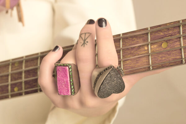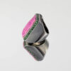 The Bubble Gum Mint Ring is a sculptural piece that shows off its unique beauty and elegance in a bold way. It balances raw beauty with architectural clarity. Alex Armen made this one-of-a-kind ring from the Muse & Fame Collection. It features a striking rectangular piece of Pink Cobalt Calcite that glows with a natural warmth on its crystalline surface.