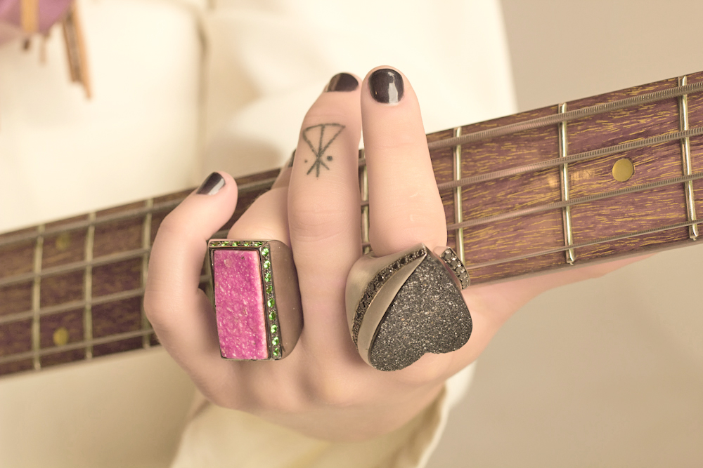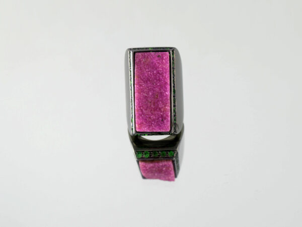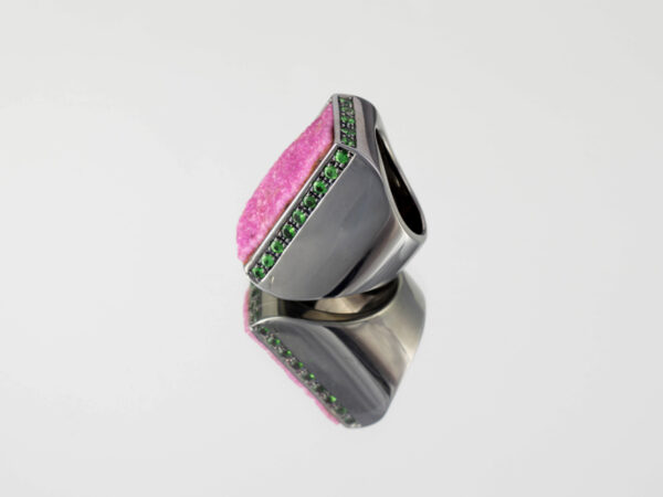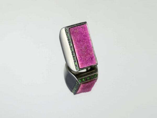 The bright Green Tsavorites on either side of the composition create a sense of symmetry and tension, a mix of softness and edge. The setting is crafted from high-polish sterling silver, which reflects light and shadow perfectly, as shown in the picture.