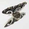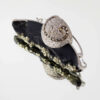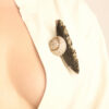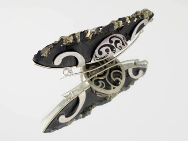 The back of the brooch features mirrored, swirling silver details that complement the front’s elegance and add depth to the craftsmanship. A single-hook pin mechanism makes sure that it stays on securely and looks good.