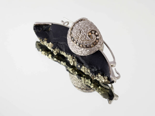 The Muse Brooch is a one-of-a-kind piece from Solitaire x Alex Armen Muse & Fame Collection. It is a sculptural tribute to inspiration and the beauty of the natural world. The core of the piece is a dramatic mix of Rare Slate and Pyrite that looks like the shine of mineral-rich land. It was cut in Idar-Oberstein, Germany, the gemstone capital.