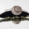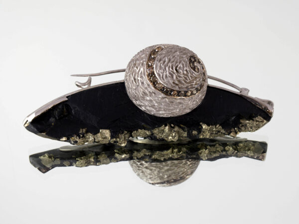 The brooch has a big silver sphere with a crescent of Chocolate Diamonds on it. The base is dark and features gold-toned mineral fragments. The piece is crafted from sterling silver and expertly shaped into a unique design. It balances natural irregularity with sculptural precision.