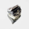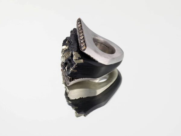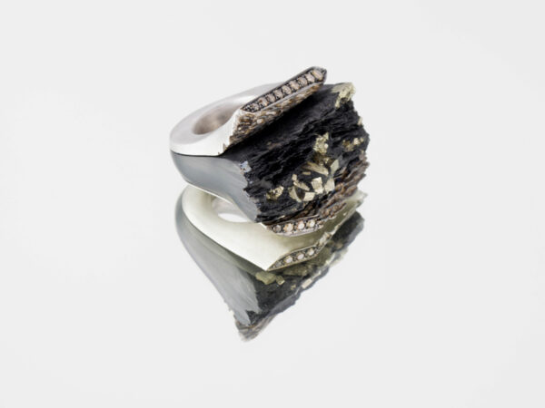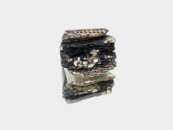 The Muse Ring is a one-of-a-kind bold fusion of raw mineral beauty and sculptural form, part of Solitaire x Alex Armen Muse & Fame Collection. The Muse Ring has a cluster of Rare Slate and Pyrite that shimmers with natural metallic hues. The element was cut and then sent from Idar-Oberstein, Germany, a city known for its gemstone industry.